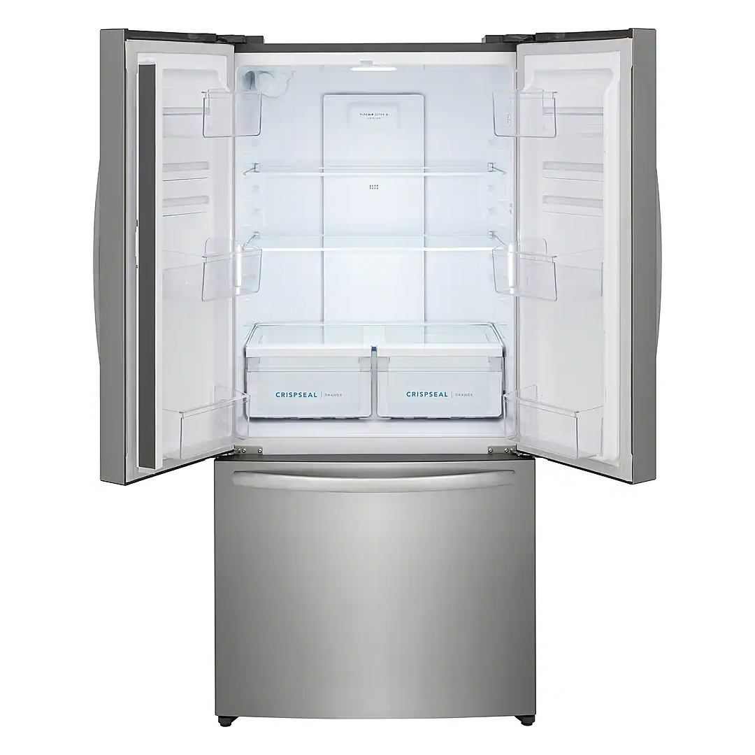 This 31.5″ Frigidaire French door refrigerator helps keep fruits and vegetables fresh for longer with our CrispSeal crispers, which block out dry air from entering your crisper. Also find a place for all your favorites with our gallon door bin storage, edge to edge glass shelves and a 3 tier freezer storage.